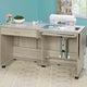 Large projects that need additional room are the target market for the Quilter's Vision. By extending the front, back, and right leaf extensions, its surface can increase in size by over two times. Every extension functions on its own and can be positioned as required. Repositionable for various purposes, the accompanying Companion Chest has spacious compartments for storing items.